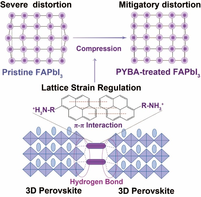 在本工作中,作者尝试通过将一种功能化的有机阳离子对(4-芘氧基丁胺,PYBA)引入到甲脒钙钛矿的晶界处,进而调控FAPbI3钙钛矿的晶格应变。此种情况下,PYBA阳离子头部的四个苯环可以形成强的π-π相互作用,为引入外部压缩应力提供坚实支点,同时尾部的氨基通过氢键与钙钛矿的[PbI6]4-八面体相连,以平衡FAPbI3晶体固有的张应力。实验结果表明,PYBA阳离子作为FAPbI3钙钛矿的晶体模板,诱导α-FAPbI3相的择优取向生长,同时提供的外部压缩应变,补偿了FAPbI3晶体的固有拉伸应力,成功实现了带隙红移且纯α-FAPbI3相的甲脒钙钛矿薄膜。受益于改善的光学和电学性能,PYBA处理的甲脒钙钛矿太阳能电池实现了24.76%的光电转换效率和改善的器件运行稳定性。这项工作中,该团队结合材料设计与结晶动力学调控,成功制备了高效稳定的甲脒钙钛矿太阳能电池器件。该工作不仅为解决甲脒钙钛矿的残留晶格应变问题提出了新策略,而且为进一步制备更高性能的钙钛矿太阳能电池提供了新思路。