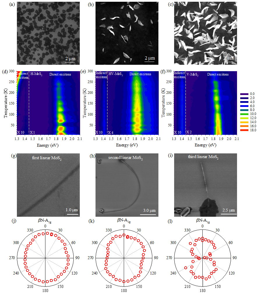 激子和声子特性对控制二硫化钼(MoS2)的光学性质起着至关重要的作用。作者通过制备并研究不同形貌的MoS2中的光子和激子行为发现:(1)对于同一SiO2/Si衬底上合成的水平取向MoS2(H-MoS2)、水平和垂直取向MoS2(HV-MoS2)和垂直取向MoS2(V-MoS2),7-300K的温度光致发光研究发现,除直接激子A和B峰外,三种样品均被发现了间接激子I峰,并在低温下分裂成了三个间接激子峰。与直接激子相比,间接激子更易受到MoS2取向的影响。V-MoS2的激子活化能更大,其激子-声子耦合强于H-MoS2;HV-MoS2的激子性质与V-MoS2更为相似。(2)对于同一SiO2/Si (285 nm,500 μm)衬底上三种不同的线性纳米结构MoS2,角分辨偏振拉曼光谱(ARP)检测发现,三种线性MoS2因形貌和结构的不同呈现出不同的声子特性,并且均表现出小尺寸效应;第一和第二种线性MoS2为纳米带状结构,第三种线性MoS2则为管状结构。以上工作为具有不同纳米结构的二维材料的光学各向异性检测及其光电应用提供了参考。