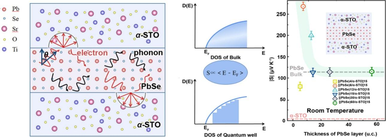 铅基二元硫族半导体PbX (X=Se, Te)是非常有应用潜力的热电材料,受到研究者的广泛关注。K体育·「中国」官方网站能量转换材料与器件课题组宁兴坤等人采用脉冲激光沉积技术制备了高质量PbTe/非晶SrTiO3多重量子阱超晶格,研究发现由于量子限域效应,PbTe/非晶SrTiO3多重量子阱超晶格结构在室温下获得了高达40.9 μW cm-1K-2的PF值[Advanced Functional Materials, 2023, 33:2303981]。在另一项工作中,他们利用PbSe替代了PbTe,由于PbSe薄膜具有更好的附着性能,其作为量子阱的厚度可以进一步减小,从而可以显著增加Seebeck系数,PbSe/非晶SrTiO3量子阱超晶格在室温下获得了24.5 μW cm-1K-2的高PF值。同时,通过调控PbSe量子阱的厚度,使其在声子的平均自由程尺度范围内,大幅降低了热导率,成功实现了电输运和热输运参量的解耦[Acta Materialia, 2024, 262:119452]。