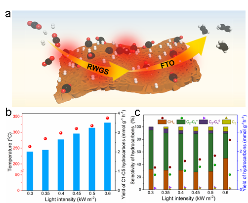 全球工业化不可避免地导致了化石能源的广泛利用,CO2被大量释放到大气中,从而造成了严重的环境影响。低碳烯烃(C2-4=)在石化、能源生产和医药等多个领域作为主要化学原料发挥着至关重要的作用,利用CO2催化转化生产低碳烯烃显示出巨大的潜力。然而,在工业中,热驱动催化CO2加氢获得低碳烯烃的过程需要持续的高能耗散,利用清洁太阳能驱动CO2常压转化为高价值的C2+产品意义重大。本文设计了一种双功能Cu促进CoFe合金催化剂,用于模拟太阳光驱动光热转化器件,实现光致热催化CO2加氢制低碳烯烃。催化剂的双功能设计结合了金属Cu和CoFe合金的协同效应,提高了CO2加氢到多碳产物性能。实验和理论计算结果证实了Cu助剂在增强CO2的吸附和氢溢流方面起着关键作用,同时CoFe合金促进C-C偶联到C2-4烯烃产物。本工作为双功能催化剂的设计实现CO2高附加值转化提供了新的见解,并为太阳能可持续利用开辟了新的可能性。
