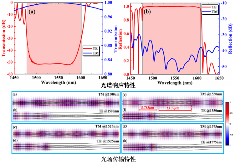 具有高反射率的布拉格光栅被广泛应用于片上滤波、传感和激光器中。然而,在标准的220 nm绝缘体硅(SOI)平台上实现宽带平坦响应的布拉格光栅仍是挑战。在本工作中,作者将槽波导的局域光场增强作用与布拉格光栅互补融合,通过啁啾和锥形设计实现了光子带隙的叠加拓宽,并维持了平坦的光谱响应。理论分析表明在91nm 波长范围内的 TE 模式具有-50dB的超高传输抑制率和大于0.99 的反射率,而TM模式下则保持了大于 0.98 的高透过率,实验结果表现出了良好的一致性。该工作为高性能的片上光栅滤波器件设计提供了新的思路。