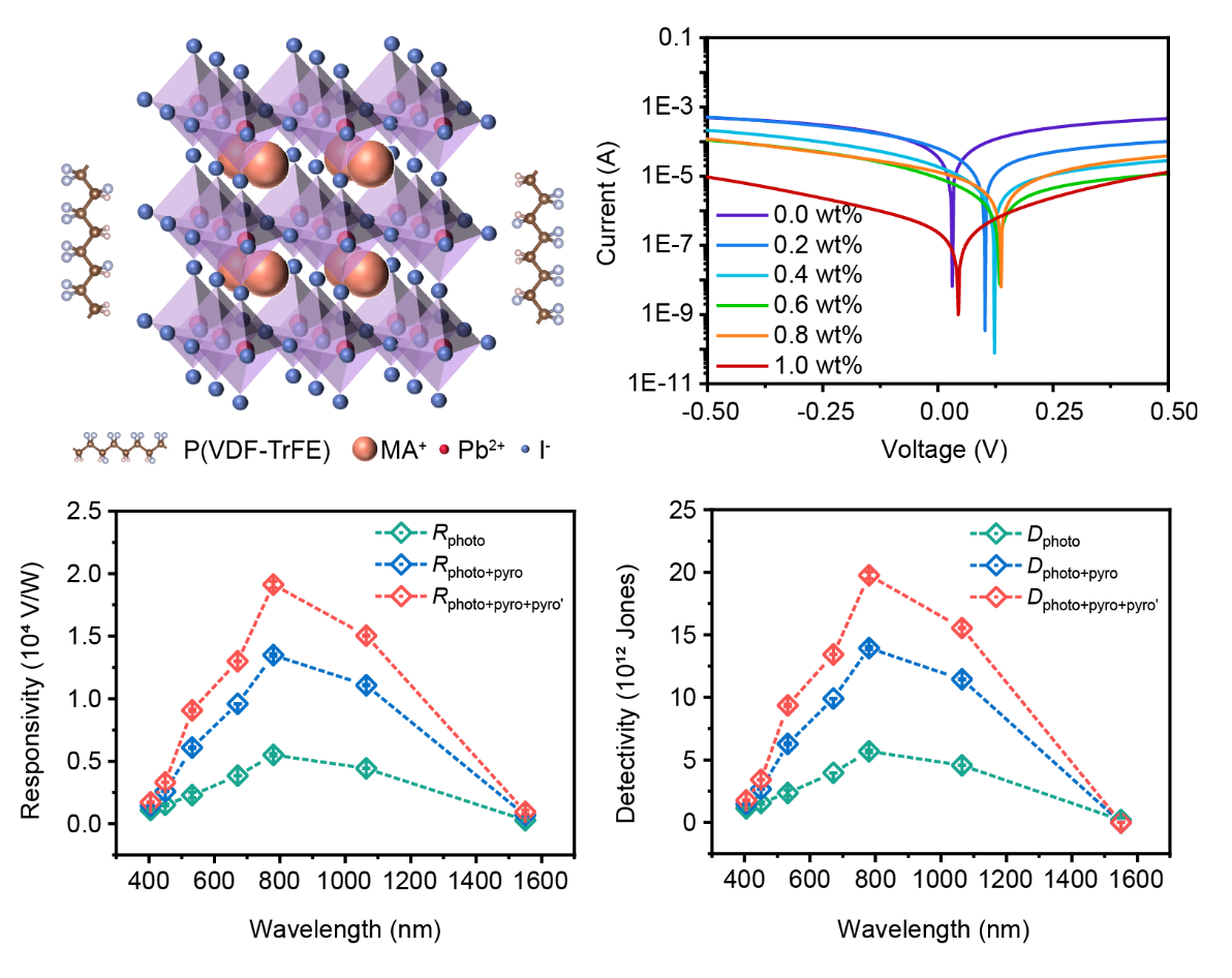 近年来,以MAPbI3(M=CH3NH3)为代表的三维有机-无机杂化钙钛矿材料因其载流子迁移率高、光吸收系数大、易于溶液加工等特点被广泛应用于高性能光电探测器设计制备中。在该项工作中,作者通过铁电聚合物P(VDF-TrFE)掺杂,有效钝化了MAPbI3薄膜缺陷并引入了热释电光电子学效应,大幅提升了MAPbI3/Si异质结光电探测器的性能,其响应度(R)和探测度(D)分别达到了1.93×104V/W和1.99×1012Jones,而响应时间仅为81.6/208 μs。此外,MAPbI3:P(VDF-TrFE)/Si异质结光电探测器还表现出优异的弱光探测能力,如在6.37 μW/cm2的光照下,探测器的响应度和探测度分别高达8.99×104V/W和9.30×1013Jones。该工作为设计制备高性能钙钛矿/硅异质结光电探测器提供了新思路。