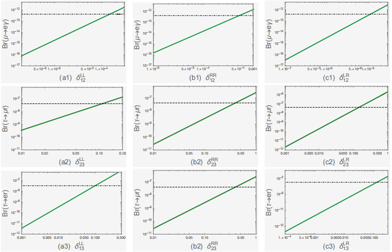 图1 lj->1iγ过程的分支比随参数δij的跑动,点虚线代表lj->1iγ过程目前的实验上限
