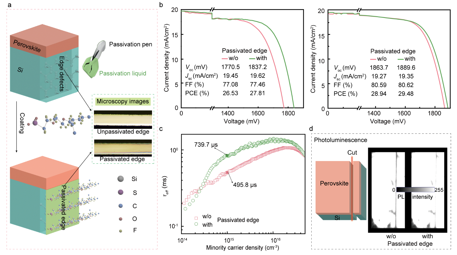 本研究给出了叠层电池一种新的提效思路:钝化边缘缺陷。基于课题组早期发现的“可翻转界面态偶极子钝化”,提出一种低温、非真空液相边缘钝化策略,抑制了叠层电池边缘缺陷复合,提升了叠层器件转换效率:效率绝对值增加1.2%,获得29.48%的钙钛矿/晶体硅叠层电池(边缘钝化前效率为28.94%)。该工作为目前叠层电池研发提供了增效新策略,为未来叠层组件功率提升储备新的技术方案。