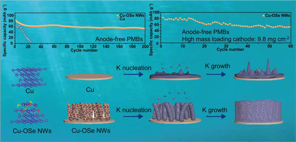 先进材料与能源器件团队通过使用不完全硒化的Cu-OSe纳米线(Cu-OSe NWs)作为亲钾宿主实现了长循环寿命的无负极钾金属电池,研究发现Cu-OSe键为K成核提供了丰富的活性位点。此外,低K+迁移能垒有利于K在Cu-OSe NWs表面的扩散。得益于以上作用机制,该集流体用于无负极钾金属电池取得了200次稳定循环突破,库伦效率可达98%,钾枝晶也被明显抑制。该工作为无负极钾金属电池的应用提供了可参考的集流体设计方案。