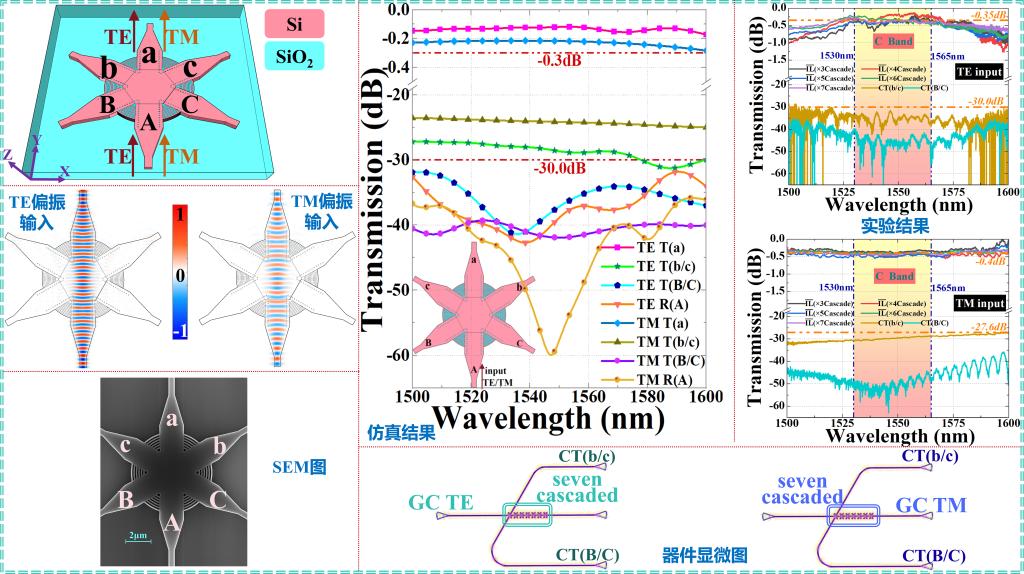 随着大数据、生成式人工智能等新一代变革性信息技术的涌现,微处理器的性能正面临前所未有的挑战,与集成电路兼容的硅光芯片是最具潜力的技术路径。交叉波导耦合器是实现高集成度、大容量硅光芯片最重要的元器件之一。本工作中,作者提出采用多种超构亚波长光栅阵列复合的方法,分别对光信号的波前和模式进行精细调控,首次实现了偏振无关的3×3星型交叉波导耦合器,尺寸仅12.68×10.98 μm²。实验结果表明,在光通信C波段,器件具有优秀的性能,其中插入损耗IL ≤0.35 dB/0.4 dB (TE/TM),串扰CT ≤-31.5 dB/-28.6 dB。该器件可用于构建面向光互连、光计算、片上传感等应用的高性能硅光芯片,器件原理为硅光芯片设计提供了新的思路。