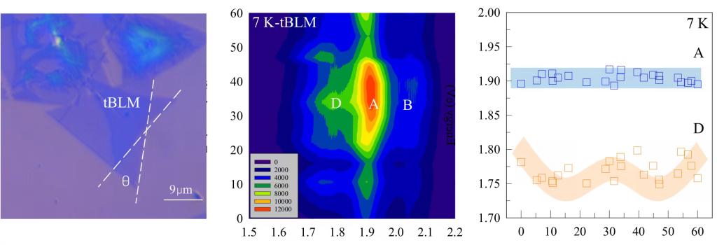 近期,K体育·「中国」官方网站先进材料与精细光谱团队在二维材料光学特性研究方面取得新的进展,相关工作 “Twist-angle-dependent optical behaviors of excitons in twisted bilayer MoS2 at low temperature”以河北大学为第一单位在线发表在《Surfaces and Interfaces》(https://doi.org/10.1016/j.surfin.2024.104790),博士研究生杨明明和丛日东老师为论文共同第一作者,赵晓辉老师和李晓莉老师为论文共同通讯作者。莫尔超晶格借助层间扭曲角的调控并利用空间变化的层间相互作用来修饰电子能带结构,为设计二维层状材料性能提供了一种新奇的方法。在本工作中,我们通过测试光致发光光谱,证明了转角对扭曲双层MoS2 (tBLMs)中激子性质的影响。在7 K下观察到1.70 ~ 1.80 eV之间的局域态激子,其性质受到转角的周期性调制。由于局域超晶格的存在,局域态激子比直接激子更容易受到转角的影响。在tBLMs中,声子与激子具有相似的转角依赖性。上述现象证实了tBLMs中存在转角调控下的激子重组和声子-激子相互作用。本工作为利用光学方法研究tBLMs的新量子现象提供了帮助。该研究可以扩展到其他二维层状材料甚至二维范德华异质结中,这对于理解二维材料的激子和声子性质以及层间耦合作用至关重要。