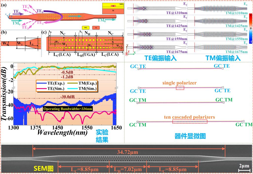 近日,K体育·「中国」官方网站光信息技术团队在硅基起偏器芯片的研究中取得新进展。相关工作“High-performance and ultra-wide bandwidth silicon TM polarizer with suppressed reflection utilizing a tailored contra-mode conversion Bragg grating”发表在《Optics Letters》(2024, 49(17))。吴胜保副教授为第一作者,姚晓天教授为论文通讯作者,硕士生于千里、张磊为建模分析、芯片制作和测试的主要贡献者。