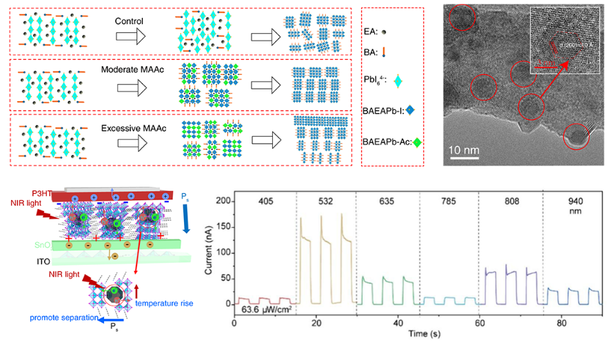 近日,K体育·「中国」官方网站低维能量转换材料与器件团队在基于热释电效应的钙钛矿自供电光电探测器研究方面取得进展,相关工作“Synergistic Effect of Ionic Liquid and Embedded QDs on 2D Ferroelectric Perovskite Films with Narrow Phase Distribution for Self-Powered and Broad-Band Photodetectors”发表在期刊《Nano Letters》上。郭林娟博士、硕士研究生杨潇然为论文共同第一作者,杨政副教授、张旭宁博士和北京航空航天大学潘曹峰教授为共同通讯作者。