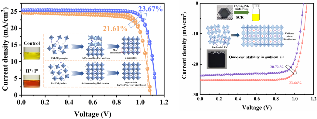 钙钛矿前驱体溶液中存在复杂的化学演化,使得MA在FAMA混合体系钙钛矿中的作用还远未被完全了解。作者研究阐明了过量的H+促进了以FA为主的钙钛矿中MA和FA组分的平衡和快速组装,并阻碍了前驱体溶液中MA和FA之间的亲核反应引起的不利化学演化,而I−氧化加速了钙钛矿的原位结晶。利用这种协同效应,团队成功制造了具有任意可调x值的厘米级FAxMA(1-x)PbI3单晶。此外,引入过氧乙酸作为添加剂,使用刮刀涂布工艺制备的FA0.9MA0.1PbI3钙钛矿太阳能电池(PSCs)实现了23.7%的效率。该效率是迄今为止使用刮刀涂布工艺同时FA含量超过90%的最高值之一。本研究中开发的优化解决方案实现了卓越的稳定性,使其可以在空气条件下储存超过2个月,而电池效率不会明显下降。