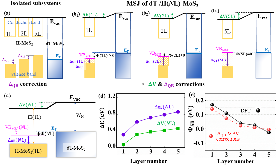 利用晶体相工程制备的二维范德瓦尔斯金属-半导体异质结具有较低的接触电阻,但其中金属-半导体异质结的界面接触机制仍有待阐明。通过研究金属性dT-MoS2与多层半导体性H-MoS2组成的质结,作者发现金属-半导体界面存在界面偶极矩和价带的层间准键两种因素的竞争,两者共同影响肖特基势垒(SBH)。具体来说,界面偶极矩增大SBH而层间准键减小SBH,二者竞争的总效果是p型肖特基势垒随层数的增加而减小(见下图)。以上机制也适用于其它过渡金属硫族化合物的范德瓦尔斯金属-多层半导体异质结,从而为实现二维半导体的p型欧姆接触提供了新思路。