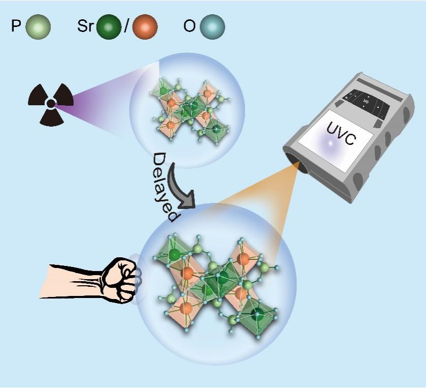 应力发光有着数百年的悠久历史,传统的应用领域包括节能照明与显示、信息存储和读取、多模态防伪、自供能探测等。近几年,科研人员拓展了应力发光的应用边界,将其应用到X射线探测领域,开发了一种极具应用前景的延时X射线探测技术,即通过探测应力发光强度可以反推X射线剂量。目前该技术均基于可见波段的应力发光,这与周围环境光源波段相互重叠,因而该技术容易受到外界干扰。杨艳民教授、李磊朋副教授长期致力于紫外C波段的光子研究,包括可见到紫外C光子的上转换、长余辉和应力发光,这为解决上述难题提供了思路。由于臭氧层的吸收,太阳光谱中的紫外C波段到达不了地球表面,因而采用紫外C波段可以避免环境光源的干扰。为此,提出了一种基于紫外C波段应力发光的延时X射线探测方法。在受到X射线辐照后,Sr2P2O7:Pr3+体系能够产生大量载流子并将其储存于缺陷;尔后受到外界机械刺激后,这些被束缚的载流子得到释放,电子-空穴复合并将能量传递给近邻的Pr3+离子,从而产生应力发光。由于Pr3+离子特殊的电子组态,应力发光覆盖了紫外C波段,峰值位于230 nm,这可以规避环境光源的干扰,从而极大提高了该项技术的可靠性。此外,230 nm波长也是目前应力发光最短波长之一。