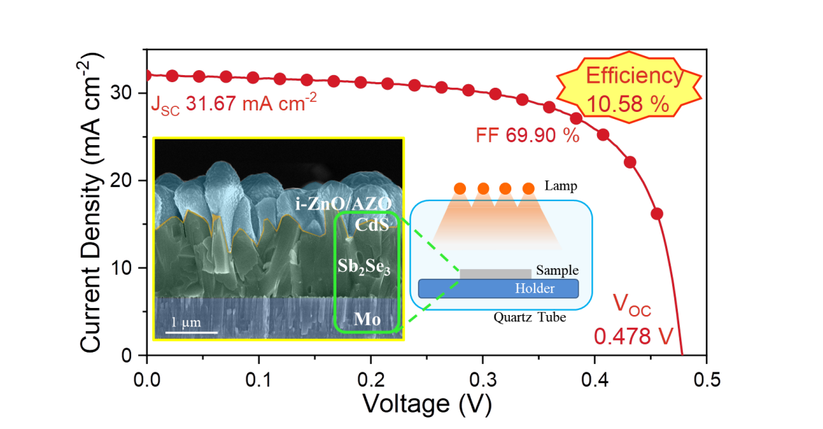 硒化锑(Sb2Se3)因其独特且卓越的光电性能,在新型光伏器件前沿科技展现出巨大的应用潜力。然而,异质结界面及吸收层内存在的载流子复合问题制约着硒化锑太阳能电池光电转换效率的进一步提升。近日,该团队提出了一种光退火处理技术,实现了Sb2Se3/CdS异质结界面的有效调控及器件光电转换效率的提升。应用光退火处理技术,能够促进异质结界面附近的元素扩散及界面原子重新排列,同时能够促进缓冲层中的镉(Cd)元素向Sb2Se3吸收层内部的扩散,这一过程有效地减少了异质结界面处的界面缺陷和硒化锑深能级体缺陷,显著提升Sb2Se3/CdS异质结的质量。制备的Sb2Se3/CdS异质结太阳能电池获得10.58%的光电转换效率(认证效率10.18%),是目前已报导的硒化锑太阳电池的世界记录。这项研究不仅展示了光退火处理在提升硒化锑太阳电池缺陷钝化方面的巨大潜力,还为光伏领域的研究人员提供了全新的研究思路。