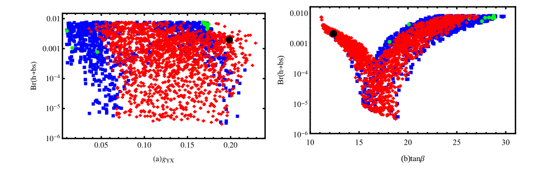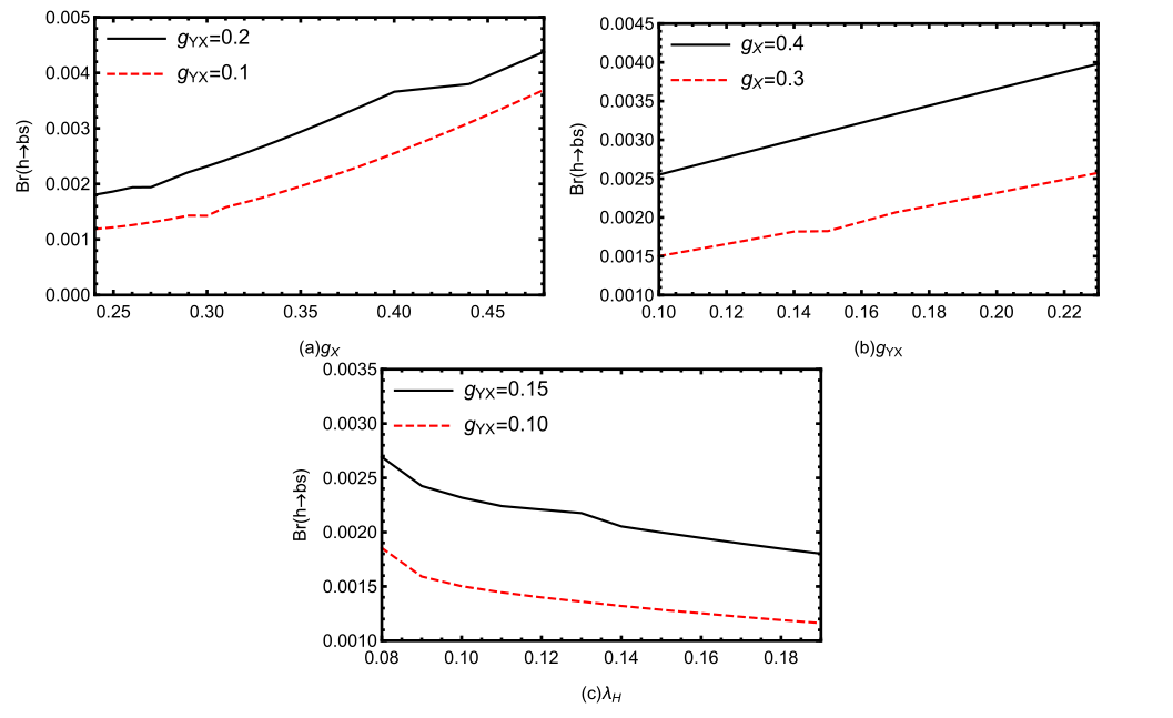 在标准模型中,改变味道的中性流(FCNC)仅在圈图层面发生,因此受到高度抑制,夸克味道破坏过程的分支比低,这在目前或未来的实验中都很难观察到。但是在U(1)xSSM模型下,由于新物理粒子的引入,提高了夸克味道破坏过程的分支比。目前,能够准确测量希格斯玻色子衰变到bb的过程,但是仍然没有证据表明衰变过程h → bs的存在,因为这种衰变模式在标准模型的分支比非常低,难以被实验观测到。对于希格斯衰变h → bs的分支比,国际直线对撞机(ILC)理论上可以达到亚百分比的灵敏度。尽管这些衰变道受到量子色动力学(QCD)背景的严重影响,在大型强子对撞机(LHC)上很难或不可能观测到,但它们可能在国际直线对撞机上轻松实现,这对于探索新物理非常重要。