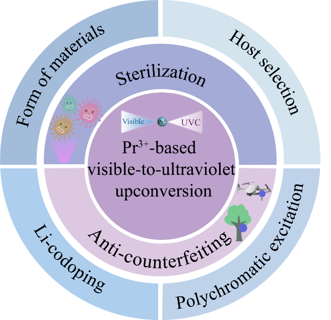 Pr3+掺杂无机体系能够将可见光—甚至是太阳光—转换为紫外光子,这种独特的上转换机制近年来受到愈发多的关注。本综述聚焦于该话题,首先介绍了Pr3+的基本知识,包括:如何通过比较Pr3+的4f5d和1S0能级间的相互位置来区分可能的跃迁发射荧光带,如何通过Pr3+的上/下转换发射的泵浦功率依赖关系来确定上/下转换所需要的光子数,如何通过时间衰减曲线来区分激发态吸收上转换和能量传递上转换。其次总结了目前流行的用于调控Pr3+掺杂无机体系可见到紫外上转换发射的四种策略:基质依赖、可调谐激发、Li+离子共掺杂、变换样品形态,同时也分析了这些策略如何影响可见到紫外上转换发射机制。然后归纳了基于Pr3+掺杂无机体系可见到紫外上转换发射机制的相关应用,重点讨论了在环境消杀和隐蔽标记领域内的应用。最后进行了总结和展望,主要包括:深入探讨硅酸盐基质的独特作用、开发玻璃/陶瓷/纤维/单晶等多物质形态、继续提高可见到紫外上转换的效率等。本综述为可见到紫外上转换领域内的研究者提供了指南和借鉴。
