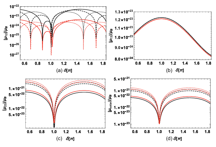 在U(1)味道依赖模型中,由于第三代费米子没有新引入的U(1)荷,因此自然引入两代右手中微子,实现了所谓的极小跷跷板机制。这种机制下,最轻中微子的质量为0,结合中微子实验的观测数据可以完全确定三代中微子的质量,中微子质量的观测是未来中微子实验的重要方向之一。通过拟合中微子混合的观测数据,和中微子跃迁磁矩的理论计算结果,我们发现未来实验对中微子混合Dirac相角和中微子跃迁磁矩的观测将完全确定该模型轻子部分的参数,极大提高模型在轻子部分的理论预言能力。相关研究发表在Physical Review D,杨金磊为第一作者和通讯作者,博士生李洁为共一作者。