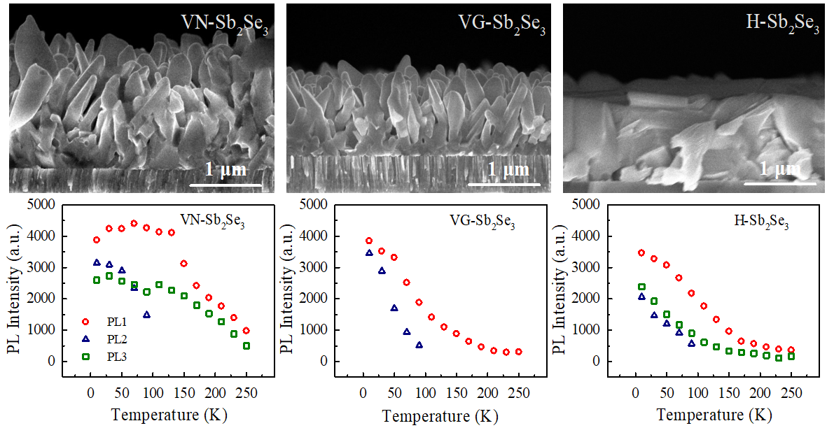硒化锑(Sb2Se3)作为热门研究材料,其光电性质与晶体取向密切相关。在该项研究中,团队采用10-300K的低温光致发光光谱,深入探究了三种不同形貌Sb2Se3的激子性质。这三种样品分别为[hkl]取向的纳米棒状Sb2Se3(VN-Sb2Se3)、晶粒状Sb2Se3(VG-Sb2Se3)和[hk0]取向的平面Sb2Se3(H-Sb2Se3)。研究结果表明,所测样品的光致发光光谱均呈现出三个特征峰,按照能量从高到低依次命名为PL1、PL2和PL3。其中,PL1峰位与Sb2Se3的带隙较为接近,可归因于带边激子的跃迁过程;而PL2和PL3峰则与材料中的缺陷相关。温度升高时,三个样品的PL2峰均在100K猝灭,表明PL2可能来自浅能级缺陷(如Sb空位),而PL3更倾向于深能级缺陷。此外,VG-Sb2Se3的PL3峰表现不明显,而VN-Sb2Se3的PL1强度在低温区域出现了异常增强的现象,是由于VN-Sb2Se3内部较高的局域化程度所引发的激子再填充过程所致,该现象在H-Sb2Se3中也有轻微体现。该结果表明VG-Sb2Se3相较于H-Sb2Se3和VN-Sb2Se3,可能具有更为优异的结晶质量和光学性质。目前,Sb2Se3广泛应用于光电和光伏器件,尤其是太阳能电池吸收材料。本研究通过光学手段,深入地揭示了Sb2Se3在不同阵列结构下的激子特性,为解决Sb2Se3在实际应用中面临的局限性提供了至关重要的物理机制层面的见解。