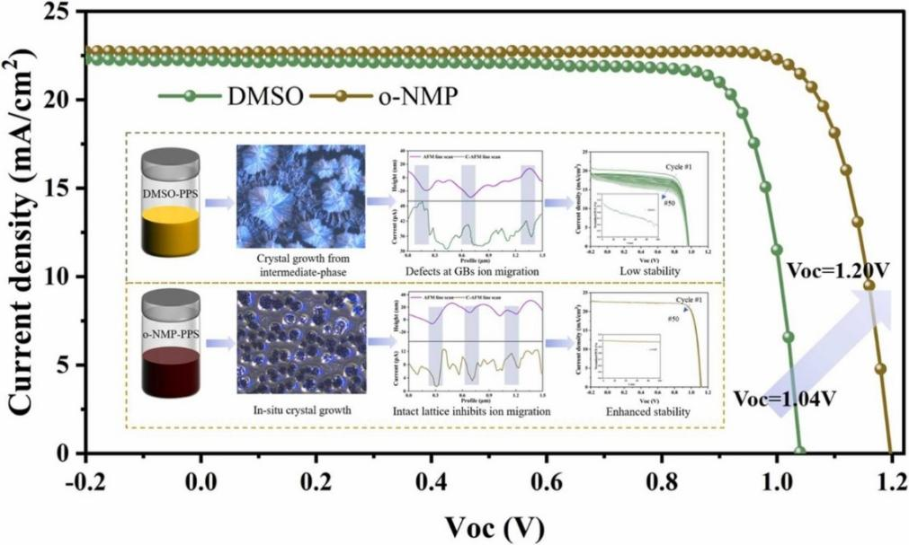 金属卤化物钙钛矿晶格结构中卤素肖特基缺陷的存在降低了离子迁移的活化能。本项研究以组分为MAPbI3的钙钛矿为原型,研究了卤素离子相关点缺陷的来源和抑制机制。研究结果表明,原始配位溶剂的使用使得MA+-PbI3-或MAI-PbI2空间分离是导致碘肖特基缺陷的主要原因。该工作通过引入氧化配位溶剂(o-NMP),最终使得MAI和PbI2可以在溶液中进行可逆的原位氧化还原反应。