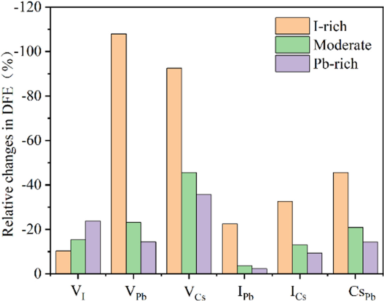 晶格应变下的本征点缺陷对钙钛矿太阳能电池的稳定性及其光电性能起着关键作用,该工作利用第一性原理方法系统探究了单轴应变与体积应变对γ-CsPbI3中常见缺陷形成能的作用机制。结果表明,拉伸应变可显著提升碘空位(VI)和铅空位(VPb)等空位缺陷的形成能,而较大的体积压缩应变则会引发VPb和铯空位(VCs)的自发形成。大量研究表明,铅卤钙钛矿晶格的Pb-I-Pb键角和PbI6八面体倾斜与缺陷形成能呈现密切关联。对于γ-CsPbI3,拉伸应变有利于增加Pb-I-Pb键角,同时减小八面体倾斜,这从根本上增强了钙钛矿的晶格对称性,从而提高了缺陷的形成能。实验上,铅卤钙钛矿的合成过程常采用碘过量环境以降低VI缺陷浓度。该工作发现富碘条件会导致点缺陷对应变的耐受性显著降低,以致于微小应变即可引发缺陷形成能的剧烈变化,例如VPb的形成能在-3%~3%单轴和体积应变范围内分别降低了近30%和100%。在所有缺陷中,VI表现出在富碘条件下更高的应变耐受性,这在理论上支持了在钙钛矿合成中利用富碘条件来稳定VI缺陷浓度的做法。该研究揭示了晶格应变调控缺陷形成的内在机理,为实验上利用应变工程提升钙钛矿太阳能电池长期稳定性和光电转换效率提供了理论依据。