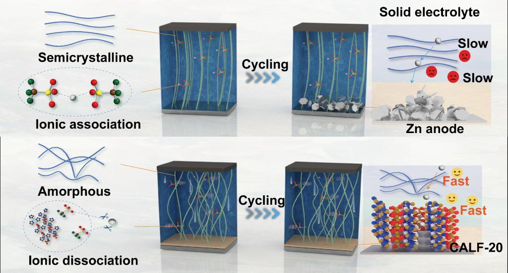 水性锌离子电池(AZIBs)具有高安全、低成本、高容量等优势,被认为是下一代储能系统的替代品。然而,水系电解液中的活性水会诱发锌离子在沉积过程中产生严重的树枝状晶体和副产物,从而造成电池寿命的衰退和失效,严重阻碍了锌电池的商业化发展进程。采用水凝胶电解质可以通过减少水的含量和调节Zn2+离子的溶剂化结构来延长AZIBs的寿命。遗憾的是,水凝胶电解质仍然含有大量的水,水的比重通常约为300%。因此,无论是在水性液体电解质还是水凝胶电解质中,高活性水分子仍然是延长锌离子电池使用寿命的难题。在此背景下,近年来报道的固体聚合物电解质(SPE)由于其近乎无水的性质,在实现高灵活性和高稳定性的AZIBs方面具有巨大的潜力。然而,SPE中超低的水含量使得锌离子传输受到极大的阻碍,从而导致了固态锌离子电池的低离子电导、电极极化、高充放电过电位等动力学问题。