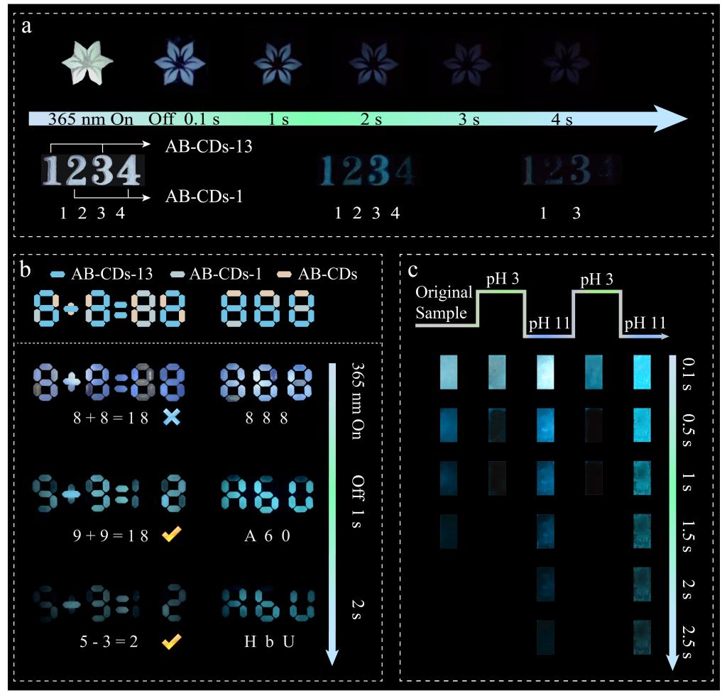 与荧光材料相比,余辉材料因其独特的持续发光特性和抗背景干扰能力而备受关注,在信息加密、生物成像、信息存储和防伪等领域具有优势。然而,大多数有机长余辉材料其合成过程复杂且成本高昂。此外,在酸性和碱性环境中,有机物中的氢离子和氢氧根离子容易破坏化学键,导致发光猝灭。本项研究开发了一种新型耐酸碱且余辉时间可调的碳点长余辉材料。基于该材料的光学特性,展示了其在光学信息加密和防伪方面的应用,同时还开发了一种用于检测酸性和碱性的pH光学试纸。