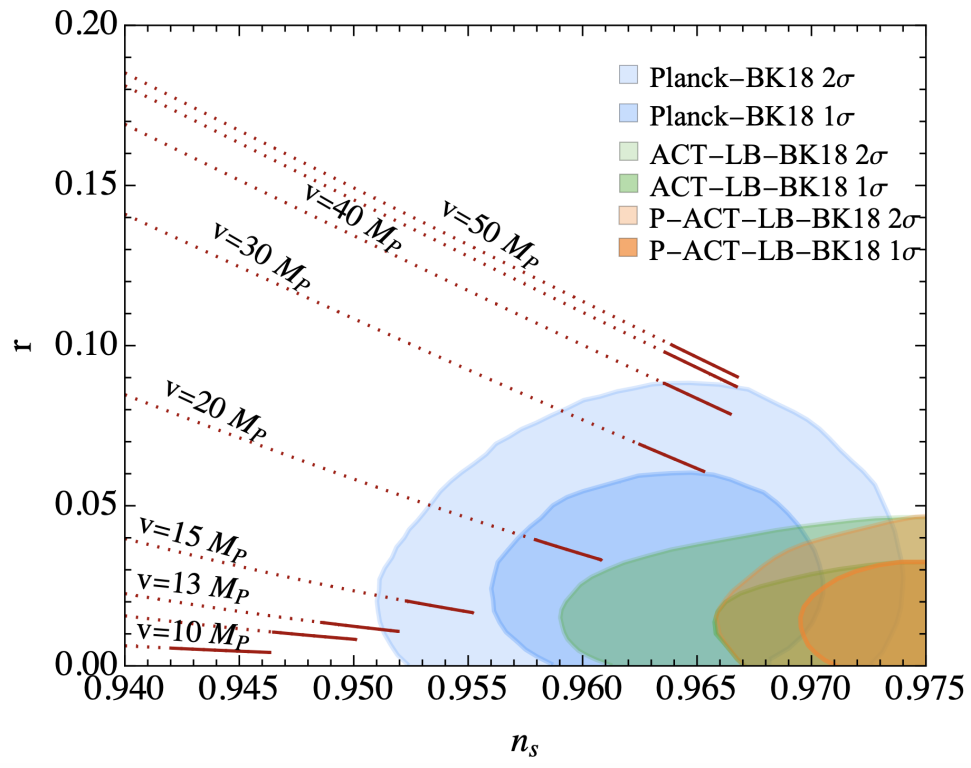 图2 Coleman-Weinberg暴胀模型的参数空间,红色线标实部分同时满足重子不对称约束