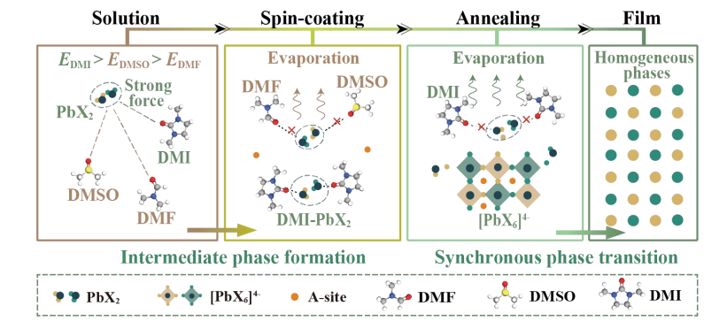 对于混合卤素组分的宽带隙钙钛矿体系,溴相和碘相的异步相变是导致不均一钙钛矿薄膜的主要原因。研究团队通过DFT理论计算筛选出1,3-二甲基-2-咪唑啉酮(DMI)新型溶剂,部分取代常见的DMSO溶剂,以调节钙钛矿薄膜的结晶过程。由于DMI与卤化铅(PbI2和PbBr2)拥有几乎相同的作用力,均匀的DMI-PbX2中间相可以稳定形成在前驱体溶液和旋涂阶段,在随后的退火阶段,DMI-PbX2中间相可以同步转化为均一卤素分布的钙钛矿薄膜。同步的相转变过程和均一的相分布,能被先进的同步辐射表征证实(in-situ GIWAXS和nXRF)。得益于钙钛矿薄膜的低缺陷态和高效载流子提取,制备的带隙为1.76 eV的钙钛矿光伏器件实现了21.42%(认证值为21.18%)的光电转换效率,这在带隙宽于1.74 eV的器件中是最高值。同时,基于高透光率的半透明宽带隙钙钛矿电池,制备的四端全钙钛矿叠层光伏器件实现了29.66%的光电转换效率。