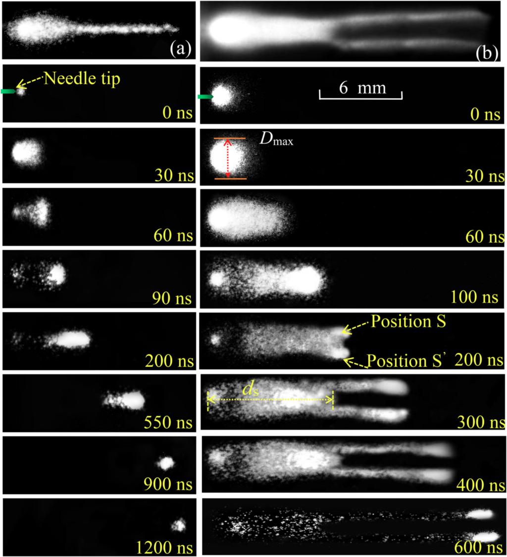 大气压等离子体射流在生物灭菌、材料处理等领域应用广泛,其产生的"等离子体子弹"(流注头)动态行为直接影响活性粒子分布。团队首次观测到开放空间中等离子体子弹的从一个分裂成两个的动力学过程,并对其放电特性、形成机制和等离子体参数进行了研究。这些结果对推动等离子体射流的应用进程具有重要意义。