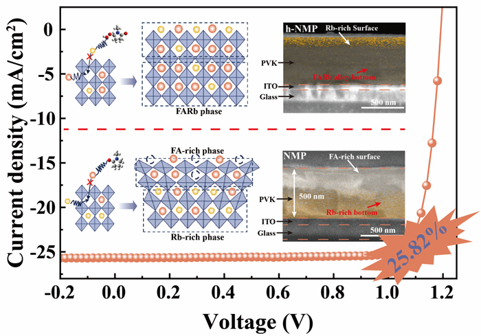 调控A位阳离子与Pb-I骨架之间的反应动力学,对于获得高质量、相均一的FA主导钙钛矿至关重要。据观察,当铷(Rb)作为A位阳离子掺杂剂时,由于其对Pb-I骨架的亲和力显著高于对FA+的亲和力,Rb+离子倾向于聚集在钙钛矿结构的体相区域。因此,Rb+离子难以缓解由钙钛矿表面体积较大的FA阳离子引起的过大拉伸应变。鉴于此,团队通过引入5-氢过氧-1-甲基-2-吡咯烷酮(HMP)作为钙钛矿前驱体添加剂,以在与Pb-I骨架反应时反转FA+和Rb+之间的顺序。HMP的引入有效地稳定了钙钛矿晶格中的Rb+阳离子,从而形成了富含Rb的表面,降低了晶格应变和缺陷。最终,在相对湿度≤55%的室温条件下,通过刮涂工艺制备的0.09 cm2钙钛矿太阳能电池实现了创纪录的25.8%的功率转换效率,52 cm2微型模块实现了创纪录的19.8%的功率转换效率。值得注意的是,这些电池表现出极小的迟滞现象,并显著增强了对光照、潮湿和高温的耐受性。