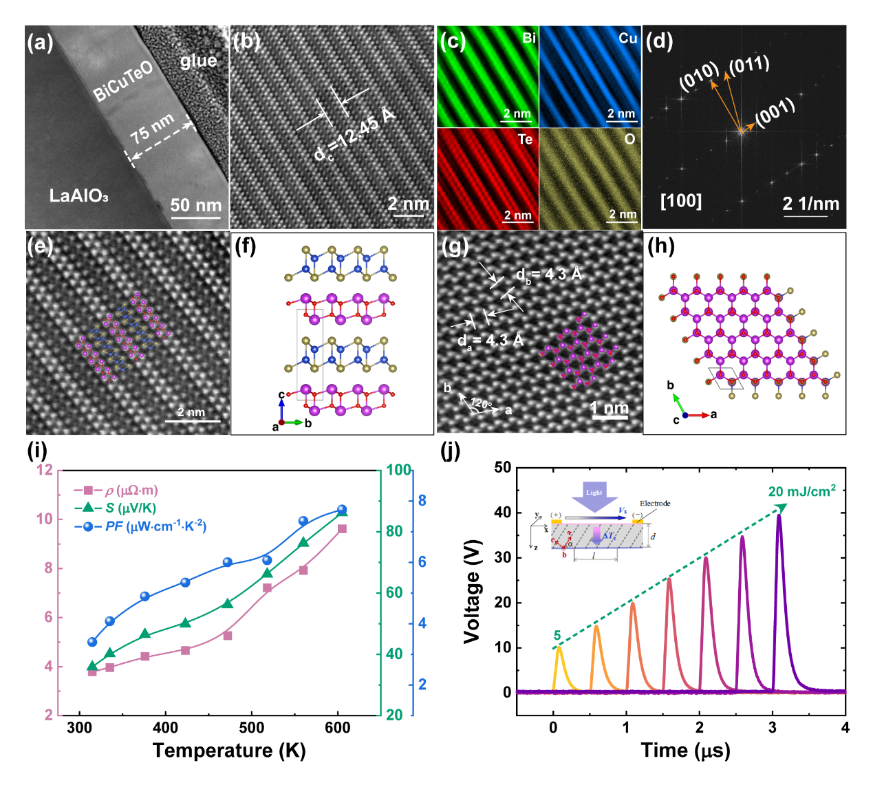 六方相BiCuTeO薄膜具有较高的电导率和塞贝克系数各向异性值,是构筑横向热电器件的理想候选材料。基于此,作者进一步制备了c轴10°倾斜的BiCuTeO薄膜并利用Ag的掺杂和复合效应协同调控了BiCuTeO薄膜横向热电器件的探测灵敏度和时间响应度。实验结果显示,在308nm脉冲激光辐照下,该探测器在无任何外加电压驱动下可获得灵敏度高达20V/mJ的开路电压输出,上升和衰减时间分别为52和195 ns,表明六方相BiCuTeO薄膜在自驱动的高灵敏快响应光探测器领域具有重要应用前景。相关结果以题为“High-performance pulsed light detector based on the transverse thermoelectric effect of the c-axis inclined BiCuTeO:Agxfilms”发表在Applied Physics Letters 127, 063501 (2025)上。闫国英为该论文的第一作者,王淑芳教授为通讯作者。
