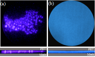图1:由ICCD拍摄的曝光时间为一个周期的两种放电的端视图(上面)和侧视图(下面):均匀放电(a)和丝状放电(b)