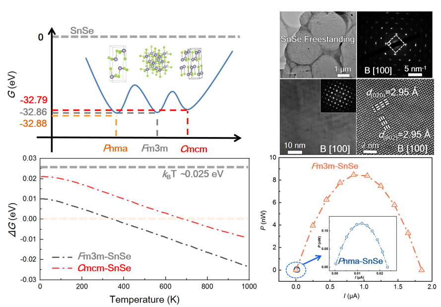 柔性热电技术可以直接将人体热量转化为电能,为可穿戴电子设备自供电提供了有效解决方案。SnSe半导体具有优异的热电性能,然而其固有的刚性和脆性限制了其在柔性热电器件中的应用。近日,K体育·「中国」官方网站能量转换材料与器件课题组宁兴坤副教授等人利用脉冲激光沉积技术结合水溶性牺牲层法,通过“亚稳相工程”策略,成功制备出兼具高热电功率因子和优异柔性的立方相Fm3m自支撑SnSe单晶薄膜。该薄膜在室温下的功率因子达到了2.39μWcm-1K2,较稳定正交相Pnma-SnSe提升近两个数量级。这种自支撑SnSe单晶膜成功消除了晶界应力集中问题,从而展现出卓越的机械柔韧性,在弯曲半径12 mm条件下连续弯折200次后,仍保持80%以上电导率。该工作为开发高性能柔性SnSe热电器件提供了新策略,相关结果以题为“Unlocking Room-Temperature Thermoelectric and Flexibility in Freestanding Single-Crystalline SnSe Membrane through Metastable-Phase Engineering”发表在Advanced Functional Materials(2025, e18193)上。宁兴坤副教授和王淑芳教授为论文的通讯作者,硕士生冉永茂和韩佳盈作为共同作者参与了此项工作。