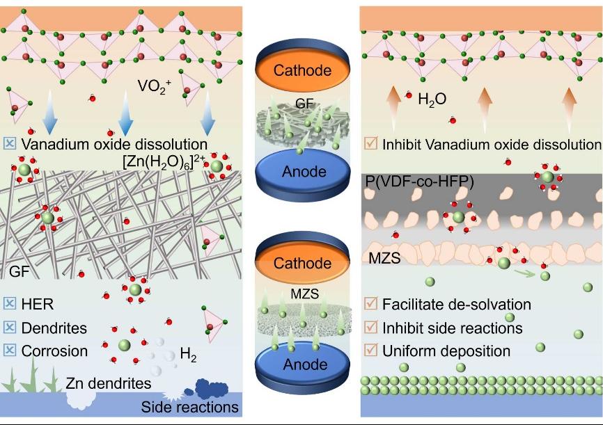 水系锌离子电池(AZIBs)具有低成本、高安全、容量高等优点,被认为是新型储能系统的有力竞争者。然而,电池的正极和负极都面临着严峻的挑战。对于正极材料,放电过程中产生的可溶性中间产物会造成正极材料的损失,导致结构稳定性和容量保持率下降。对于锌负极,锌离子在基底上的反复沉积/剥离会导致锌枝晶生长,此外水的分解还会导致氢气和副产物的产生,从而引发电池极化、容量退化甚至短路。因此,同时稳定水系锌离子电池的正极和负极对于促进AZIBs发展至关重要。该工作设计了MCM-41沸石梯度分布的双功能隔膜,用于同时稳定正极和锌负极。其中,沸石分布较多的一侧具有亲水性,沸石和水分子的结合可以降低脱溶剂能垒,从而抑制析氢反应(HER)及相关副反应;此外,沸石孔道丰富,还具备调节锌离子通量,促进锌均匀沉积的功能。而沸石分布较少的一侧,聚合物相对致密,可以抑制正极材料VO2+的溶解和穿梭,从而实现V2O5正极的稳定循环。使用这种双功能隔膜,组装的Zn//Zn对称电池的循环寿命超过2400 h(1mAcm-2,1mAh cm-2)。以商用V2O5为正极材料的全电池在电流密度为1 A g-1的情况下,经历1000次循环后仍保持212.5 mAh g-1的高容量。这为开发同时稳定正极和负极的双功能隔膜提供了一个新的方向。