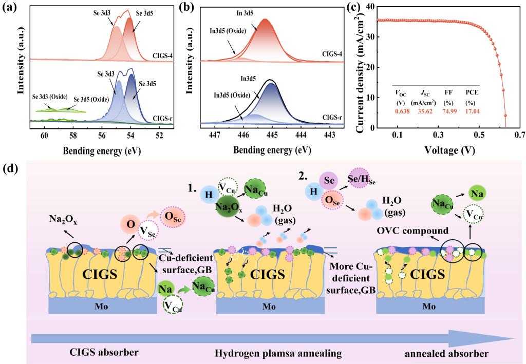CIGS太阳电池凭借其优异且稳定的光电特性,在薄膜光伏技术领域展现了广阔的应用前景。除了垂直特性外,CIGS薄膜恒横向均匀的微观结构也是大面积太阳电池光伏性能提升的关键因素。近日,该实验室提出了一种氢等离子体后退火策略,即通过在薄膜沉积后引入氢等离子体反应溅射层,基于对薄膜内部缺陷抑制和晶界处的微结构调整实现了大尺寸太阳电池转换效率的提升。氢等离子体通过上移体系费米能级消除了异质结处的VSe深能级缺陷,同时通过Na-O化合物相中Na离子激活促进了晶界处的微结构调整。两种效应共同诱导了CIGS电池界面利于载流子引出的能带结构。此外,晶界处的微结构调整及O离子的解吸附有效降低了薄膜中深能级缺陷密度,促进了电池载流子传输的横向均匀性。所制备CIGS太阳电池获得了17.04%的转换效率。该研究将为大面积CIGS太阳电池的高效制备奠定了重要基础,同时也为其他p型铜基薄膜太阳电池的光伏性能改善提供了参考。