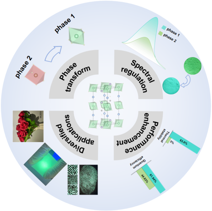 晶体场工程加速了Ce3+离子掺杂青色荧光粉的发现进程,但其结构与性能之间的关联仍不明确。团队通过K3YSi2O7基质相变将Ce3+离子发光从绿色调控至理想青色,同时将热稳定性从423 K时的5%提升至63.6%,内量子效率也从44.8%跃升至61.9%。这种相变过程将Ce3+离子重新定向掺杂到更稳定的晶格位点,有效抑制了电子-声子耦合效应和非辐射损耗。优化后的荧光粉K3Ca0.3Y0.7Si2O7:Ce3+填补了白色LED中的青色光谱间隙,使显色指数从84.9提升至97.1,并成功制备出高热稳定性的青色聚二甲基硅氧烷薄膜。此外,优化后的荧光粉成功的被应用于潜在指纹检测领域。本研究不仅开发出高性能的青色荧光粉,更阐明了晶体场工程调控Ce3+离子发光的内在机制。